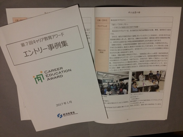 今回は、残念ながら受賞は出来ませんでしたが、「キャリア教育の進展に有為な取組」と評価され、出席者全員に配布される「エントリー事例集」へ弊社の取組が紹介されました。